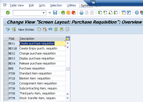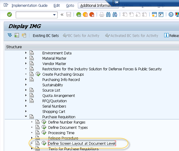 T-code − SPRO → Materials Management → Purchasing → Purchase Requisition → Define Screen Layout at Document Level and there view the details on the transaction you want to customize.