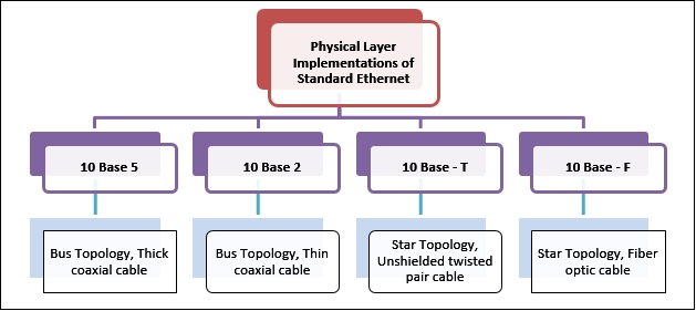 Standard Ethernet has many physical layer implementations. The four main physical layer implementations are shown in the following diagram