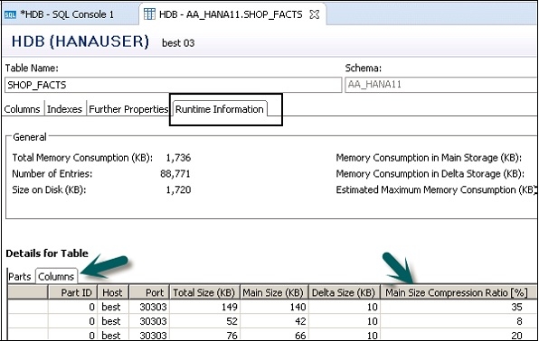 To check the Compression ratio for a table, you can navigate to Table Definition. Go to Runtime Information.