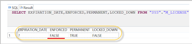 SELECT EXPIRATION_DATE, ENFORCED, PERMANENT, LOCKED_DOWN FROM "SYS"."M_LICENSE"