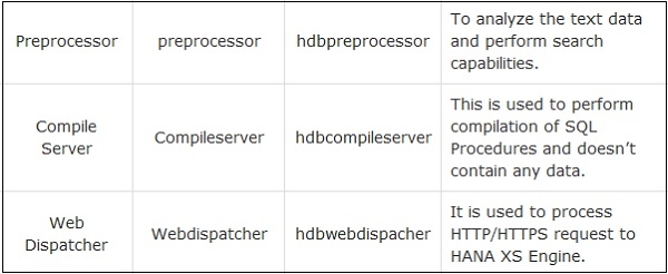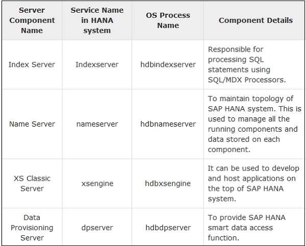 The following table lists all the key server components in HANA, the corresponding services, and OS process details.
