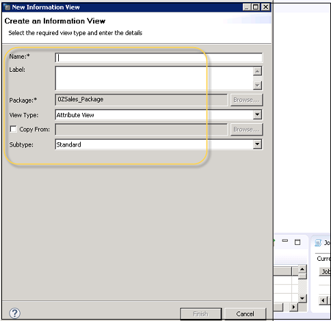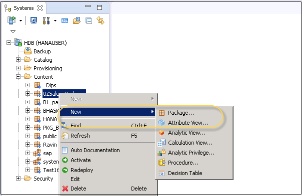 To create a new Attribute view, select the Package name under which you want to create an Attribute View. Right Click on Package → Go to New → Attribute View