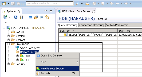Smart Data Access under Provisioning tab allows you to access and analyze the data stored in other database systems without replicating the data into HANA database. Data replication process is always time consuming and requires memory storage. Smart Data Access allows you to create virtual tables which are linked to remote system tables and data can be directly accessed in SAP HANA system with these virtual tables.