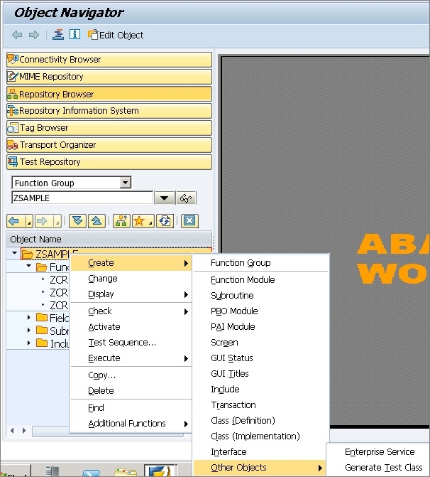 Run T-code: SE80 -> Enter the Function Group in the Function Group Area