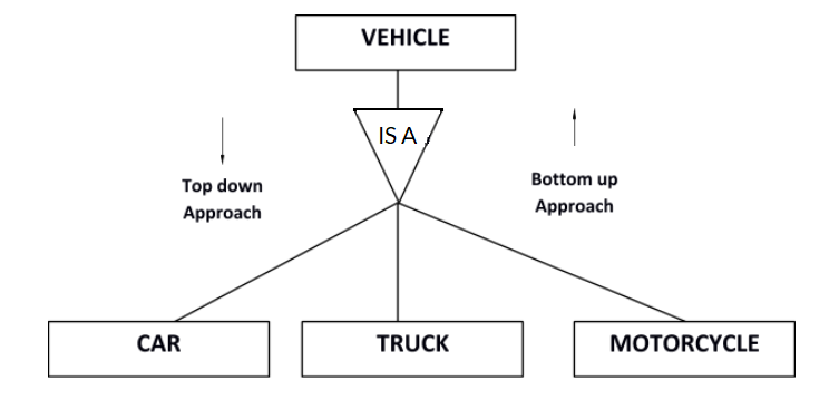It is a Bottom up process i.e. consider we have 3 sub entities Car, Truck and Motorcycle. Now these three entities can be generalized into one super class named as Vehicle.