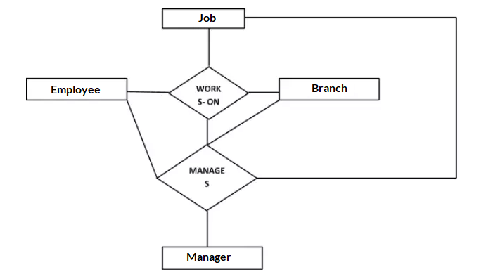 Consider a ternary relationship Works_On between Employee, Branch and Manager. Now the best way to model this situation is to use aggregation, So, the relationship-set, Works_On is a higher level entity-set. Such an entity-set is treated in the same manner as any other entity-set. We can create a binary relationship, Manager, between Works_On and Manager to represent who manages what tasks.
