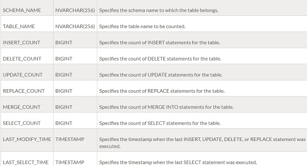 In SAP HANA database, we have an analogous table “SYS.M_TABLE_STATISTICS”.