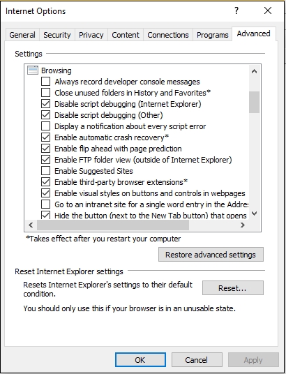 To enable this option, select Tools → Internet Options → Advanced tab. and then finally check the "Display a Notification About Every Script Error" box option as shown below −