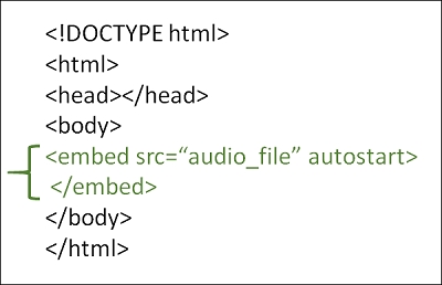 To add background music on a web page, use <embed>?</embed> element. Also, use the autoplay attribute. This will run music in the background whenever the page loads.