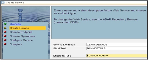 In Web Service Wizard, enter the name and short text and select Function Module as Endpoint Type