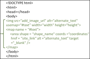 The <area> tag defines an area inside an image-and nested inside a <map> tag. The following are the attributes: