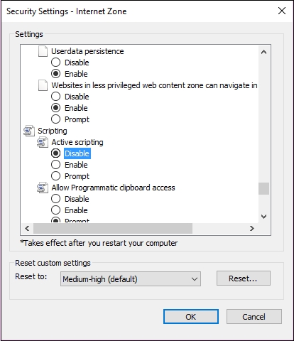 After reaching the Security Settings, go to Scripting, then Active Scripting.