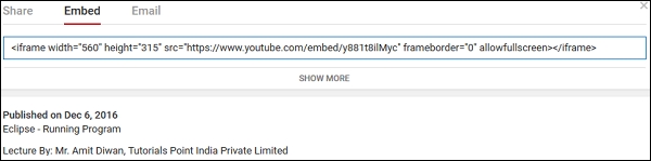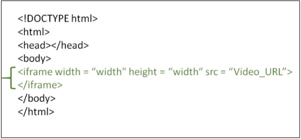 <!DOCTYPE html> <html> <head> <title>HTML Video embed</title> </head> <body> <p>Learn Eclipse</p> <br /> <iframe width="560" height="315" src="https://www.youtube.com/embed/y881t8ilMyc" frameborder="0" allowfullscreen></iframe> </iframe> </body> </html>