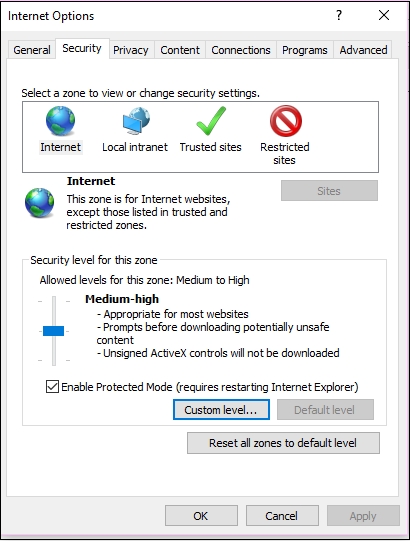 Now, a dialog box will open. Go to the Security tab and click Custom level.