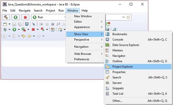 To view the project explorer, click on Window menu then, click on Show View and select Project Explorer.
