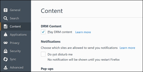 Open Firefox web browser and click Options. After clicking, you will reach the Settings. Here, click the Content tab as shown below −