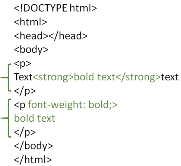 <!DOCTYPE html> <html> <head> <title>HTML text bold</title> </head> <body> <h1>Tutorialspoint</h1> <p style="font-weight: bold;">Simply Easy Learning</p> </body> </html>