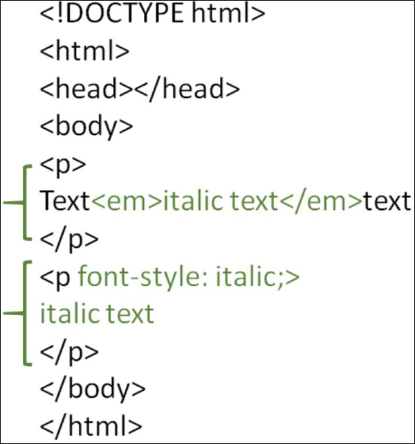<!DOCTYPE html> <html> <head> <title>HTML italic text</title> </head> <body> <h1>Products</h1> <p> Our products: <em>Online HTML Editor</em> and <em>Online Image Editor</em>. </p> </body> </html>