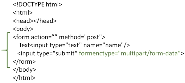 <!DOCTYPE html> <html> <head> <title>HTML formenctype attribute</title> </head> <body> <form action=”” method="post"> Name<input type="text" name="name"/><br> <input type="submit" formenctype="multipart/form-data" value="Submit"> </form> </body> </html>