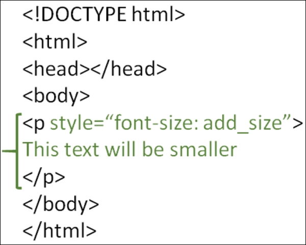 <!DOCTYPE html> <html> <head> <title>HTML smaller font</title> </head> <body> <h1>Heading</h1> <p>This is demo content.</p> <p style="color:blue;font-size:11px;">This text will be smaller.</p> </body> </html>