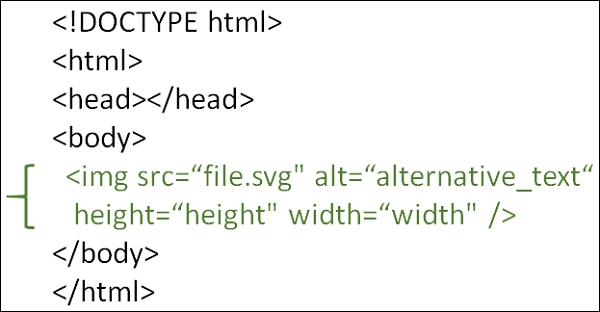 <!DOCTYPE html> <html> <head> <title>HTML SVG</title> </head> <body> <h1>Design</h1> <img src= "https://www.tutorialspoint.com/html5/src/svg/extensions/imagelib/smiley.svg" id="demo" alt="smiley"> </body> </html>