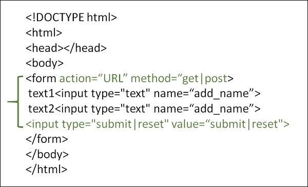 You can try to run the following code to use submit button to submit and reset a form. Under the action, attribute add the file, where you want to reach after clicking Submit button. Using get and post method, you can send the values to the PHP file added in action attribute.