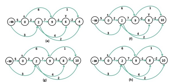 Begin initially make all nodes as unvisited for each node i, in the graph, do if i is not visited, then topoSort(i, visited, stack) done make distance of all vertices as - ∞ dist[start] := 0 while stack is not empty, do pop stack item and take into nextVert if dist[nextVert] ≠ - ∞, then for each vertices v, which is adjacent with nextVert, do if cost[nextVert, v] ≠ - ∞, then if dist[v] < dist[nectVert] + cost[nextVert, v], then dist[v] := dist[nectVert] + cost[nextVert, v] done done for all vertices i in the graph, do if dist[i] = - ∞, then display Infinity else display dist[i] done End