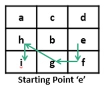 Input: The matrix as shown above. And the starting point. Here the starting point is e. Output: Enter Starting Point (a-i): e Maximum consecutive path: 5