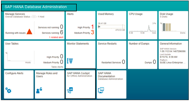 SAP HANA Cockpit with Fiori-based Launchpad shows the content in the form of tiles arranged in groups. Using these tiles, you can access individual applications and can also access app-specific data for immediate review.