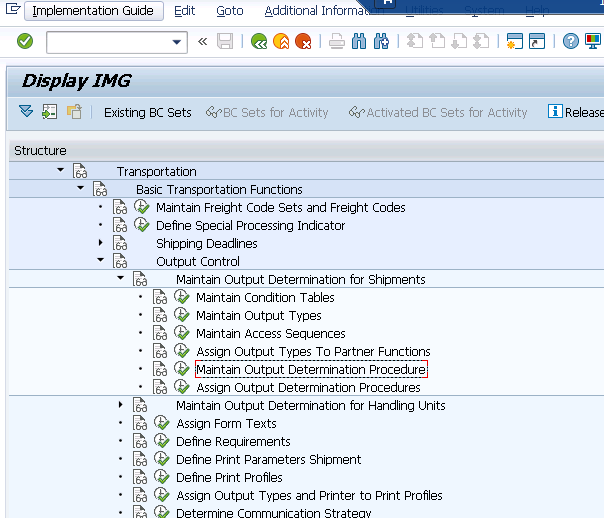 Go to SPRO → Logistic execution → Transportation → Basic Transportation Functions → Output control → Maintain Output determination for shipments → Maintain Output Determination procedure.