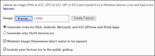 Using this create and generate icons for the Web, Android, Microsoft, and iOS apps. Choose an image from your computer and create it on a button click. The image can be in PNG, JPG, or GIF format and gets converted into a .ico file.