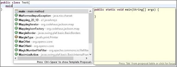 To get public static void main(String[] args) line in eclipse without typing the whole line type main and press Ctrl + space then, you will get the option for the main method select it.