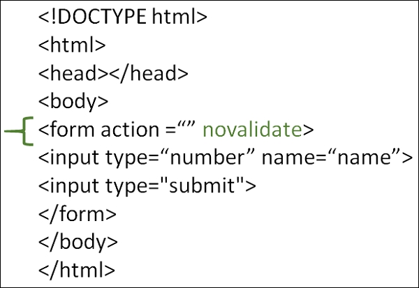 <!DOCTYPE html> <html> <head> <title>HTML formnovalidate attribute</title> </head> <body> <form action = "" method = "get"> Rank <input type="number" name="rank"><br> <input type="submit" value="Submit"><br> <input type="submit" formnovalidate="formnovalidate" value="Submit with no validation”> </form> </body> </html>