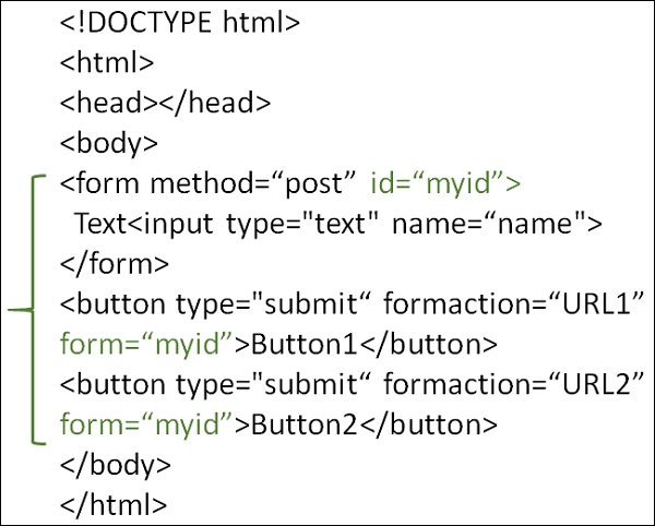We can make the formaction attribute to work outside the <form> tag. The formaction attribute is used to specify more than one submit URLs for one form. When you submit a form, the web browser first checks for a formaction attribute.